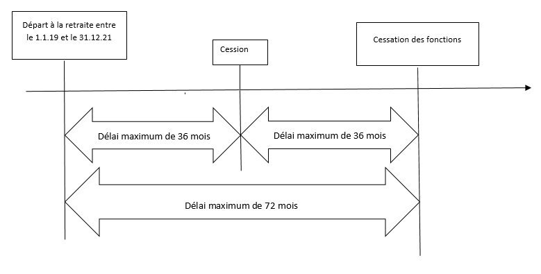 - dans l'hypothèse où la cessation des fonctions interviendrait après la cession, il ne doit pas s'écouler un délai supérieur à 72 mois entre le départ en retraite et la cessation des fonctions, sans que le délai écoulé entre chacun de ces deux évènements et la cession n'excède 36 mois.