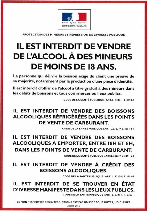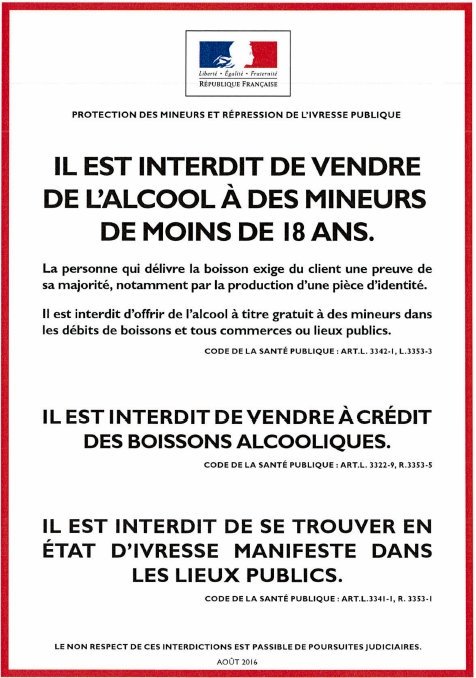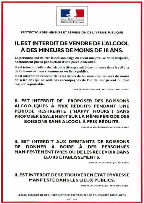 Dans les débits de boissons à consommer sur place, une affiche de format 21 x 29,7 cm (A4) reproduisant le modèle ci-dessous doit être apposée à l'intérieur de l'établissement, de manière à être immédiatement visible par la clientèle, soit à proximité de l'entrée, soit à proximité du comptoir.